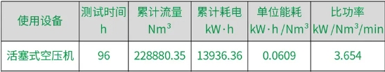 磁懸浮空壓機已正常穩定運行近3個月,經測試平均單位能耗0.0431kW·h/Nm3,節電率約為29.2%
