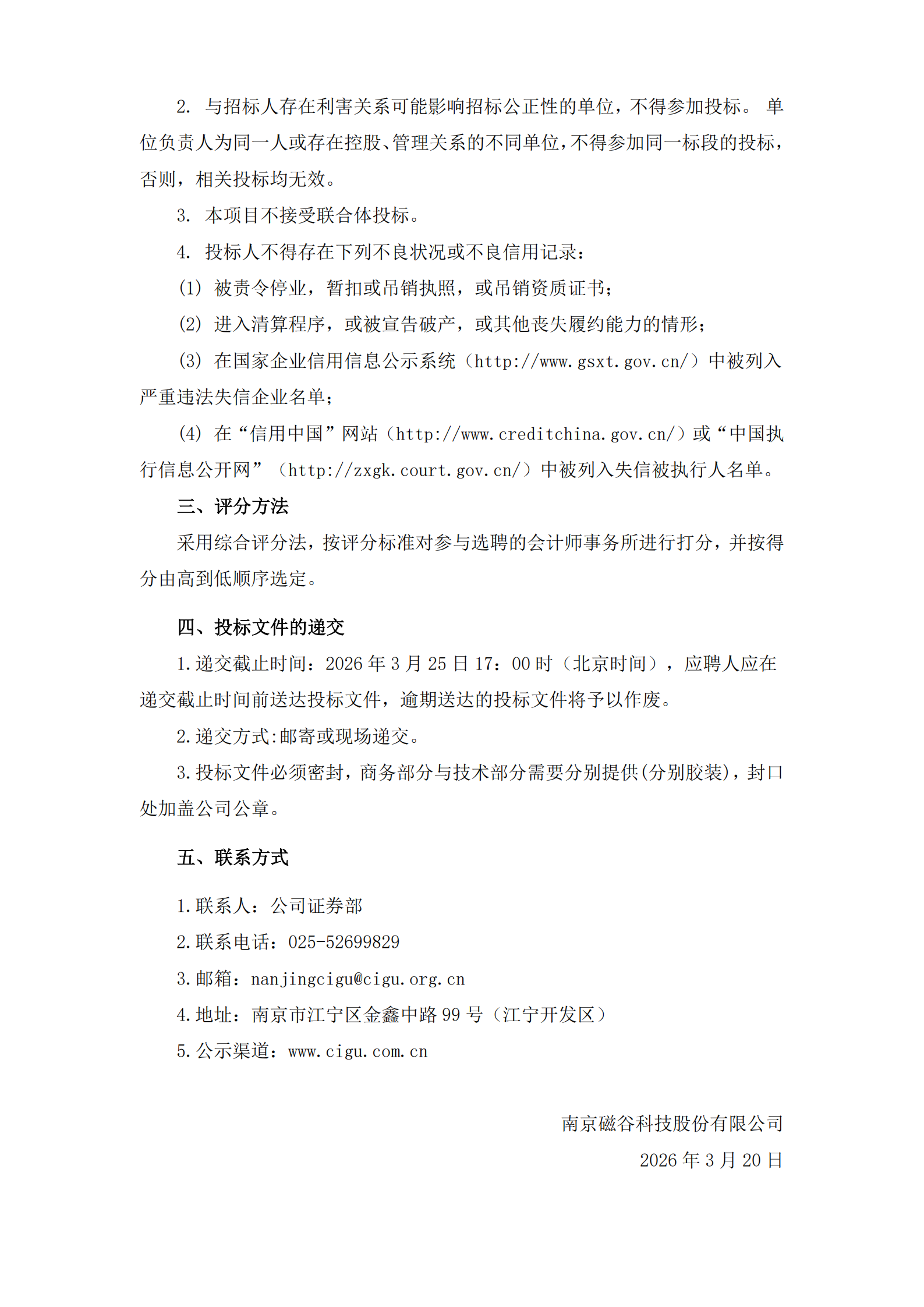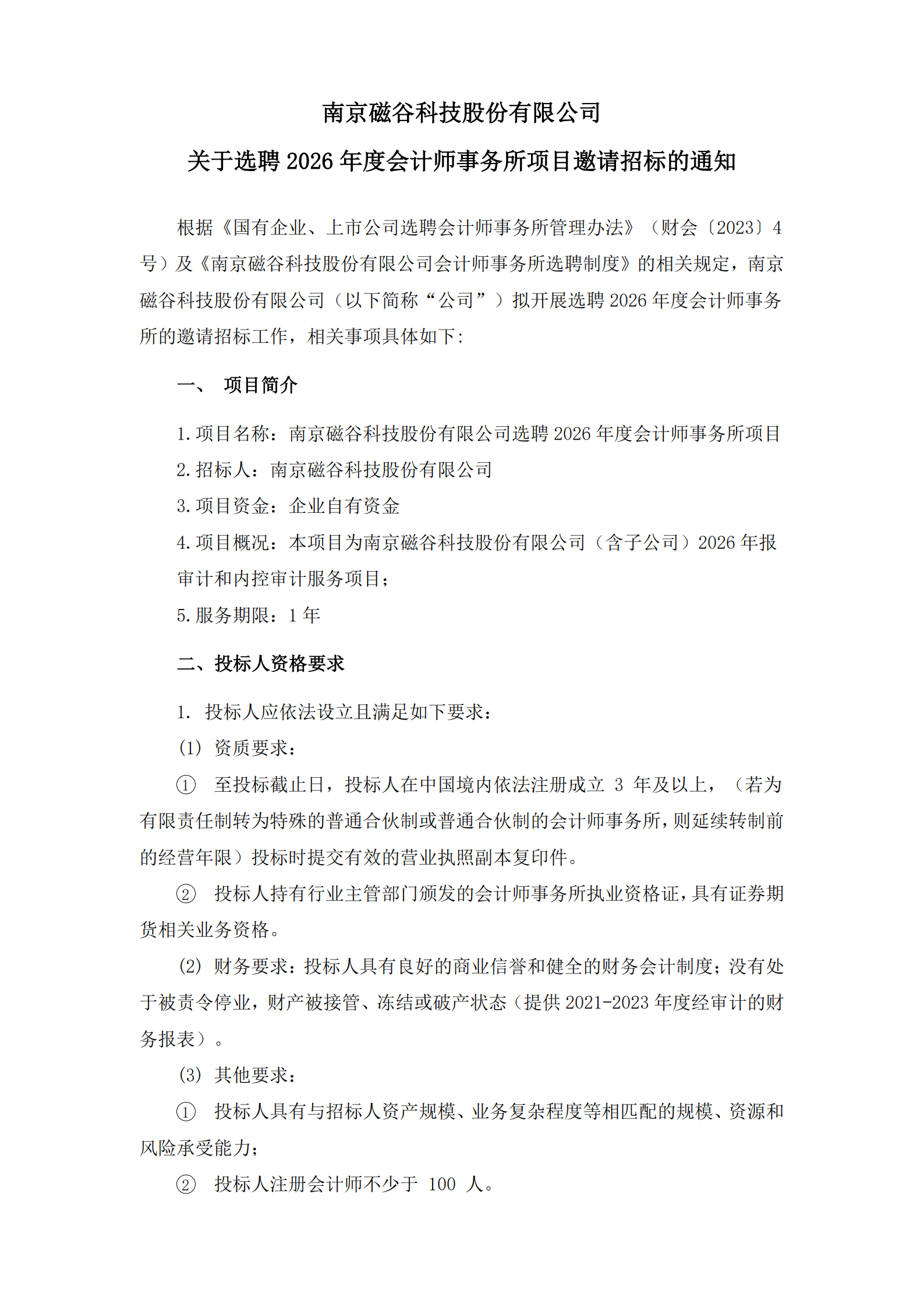 南京磁穀科技股份有限公司關於選聘2026年度會計師事務所項目邀請招標的通知